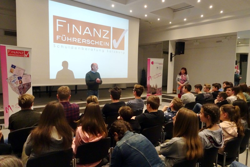 Beim Führerschein werden die Verkehrsregeln und das Verhalten im Straßenverkehr gelernt. Ähnlich wie beim Autofahren muss auch der richtige Umgang mit dem Geld gelernt werden, um nicht in die Schuldenfalle zu tappen. Aus diesem Grund startete die NMS Moßhammer in Bischofshofen im Herbst 2017 das Projekt Finanzführerschein, in Kooperation mit der Salzburger Schuldenberatung und mit Unterstützung der Schulsozialarbeiterin. Die Schülerinnen und Schüler der 4. Klassen erarbeiteten sich in vier zweistündigen Modulen Grundkenntnisse in finanziellen Belangen. In den einzelnen Modulen wurde die Wirkung von Werbung thematisiert, spielerisch wurden das eigene Einkaufsverhalten und die Verkaufstricks von Supermärkten reflektiert und hinterfragt. Die möglichen Kosten und Gefahren des Handyvertrages wurden diskutiert, sowie die Kosten und Folgekosten eines Moped-Kaufs ermittelt und thematisiert. Zum Abschluss des Projekts wurde den Schüler/innen der Finanzführerschein im Rahmen einer feierlichen Veranstaltung von der Salzburger Schuldenberatung verliehen.