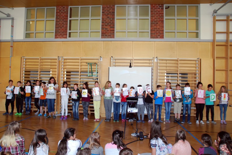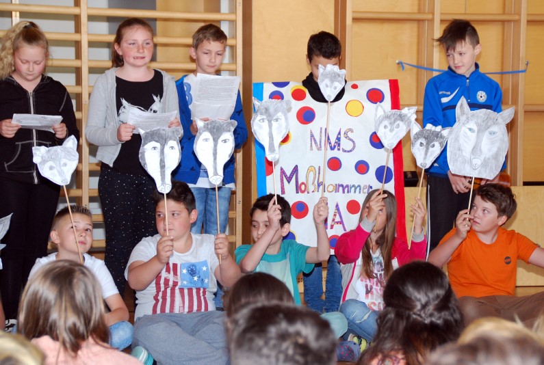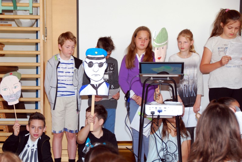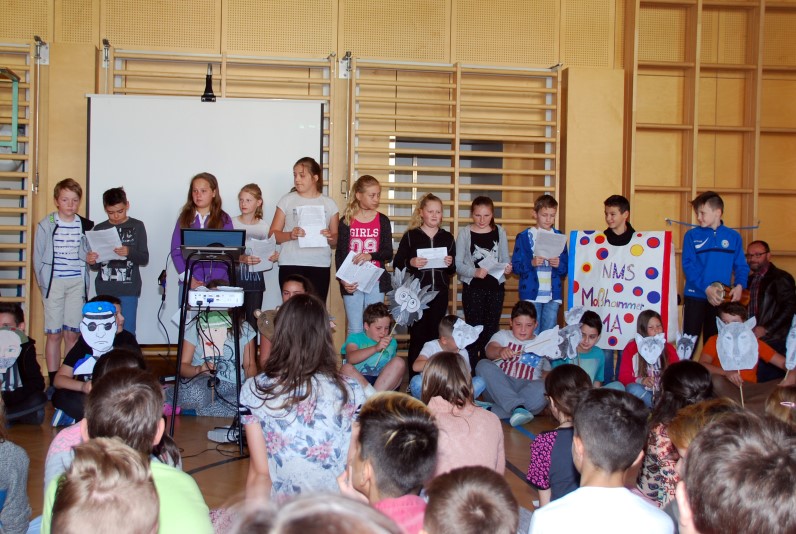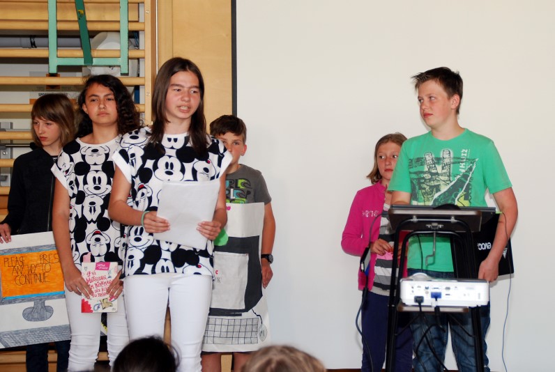 Montagmorgen hatten wir uns im Turnsaal getroffen, wo verschiedene Klassen ihre Ergebnisse zum Thema Lesen vorzeigten. Gelesenes kann ja schließlich auch in kleine Theateraufführungen verpackt werden.